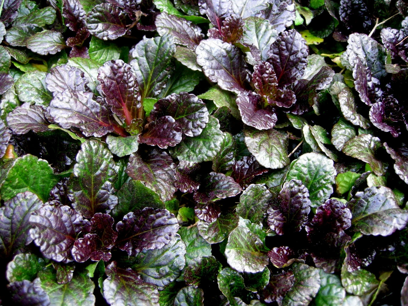 Black Scallop Bugleweed – Ajuga reptans ‘Black Scallop’. The darkest colored, almost entirely purplish-black. Ajuga make a great groundcover. Sun tolerant or part-shade. Likes moisture retentive, well-drained soil. Hardy in zones 3-9. Height: 3 inches. Sun or shade.