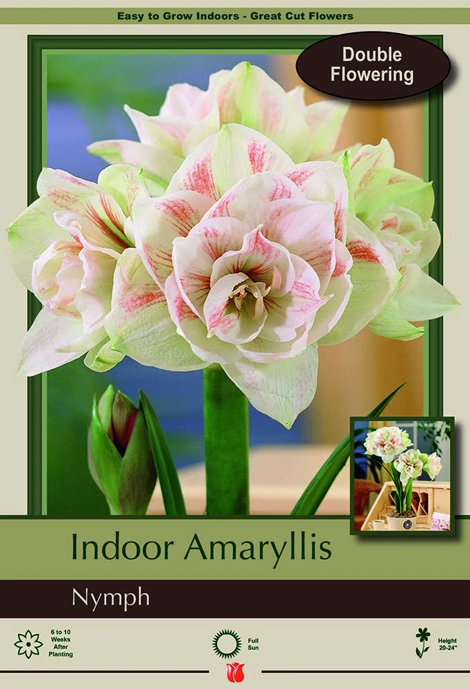 Nymph is a double Dutch hybrid that makes a spectacular showing. Measuring just 12″ tall, Nymph sports 6″ double white flowers tinged with red and pink. This sure winner will produce two stocky stems with 3-4 blossoms each.