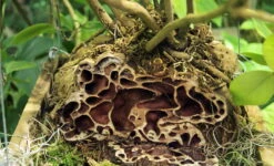Hydnophytum is a genus of epiphytic myrmecophytes (ant plants) native to Southeast Asia, the Pacific region and also extending into Queensland in northern Australia. The name is derived from the Ancient Greek hydnon “tuber”, and phyton “plant”, after their appearance with their swollen succulent stems. The species grow in tree branches and on trunks. Like the related genus Myrmecodia, they are known as antplants or ant-house plants. They form a symbiotic relationship with ants. Ant plants provide habitats for ant colonies high up into the forest canopy, protecting them from the elements and also predators because of the spines. Hollow, smooth-walled tunnels form within the caudex with external entrance holes, providing an above-ground home for ant colonies. Ants likewise provide defense for the plant and prevent tissue damage, swarming to defend their home if disturbed. Ant colonies also provide nutrients to the plants by leaving wastes within the tunnels inside the caudex. Special glands lining the tunnels then absorb nutriment for the plant. This symbiosis allows the plants to effectively gather nutrients (via the ants) from a much larger area than the roots ever could cover.
