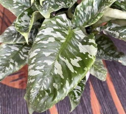Schismatoglottis Thailand is a newer rare house plant, the majority of these species are native to the Island of Borneo, but many can be found in the tropical parts of Southeast Asia, New Guinea, and Melanesia. The Thailand variety is a fan favorite due to its silvery, splattered variegation. They do best in bright indirect light. Direct sun will cause leaves to burn. Water when the top few inches of soil are dry. The plant will begin to droop a bit when it’s time, similar to a peace lily. They prefer medium to high humidity and well-drained soil.