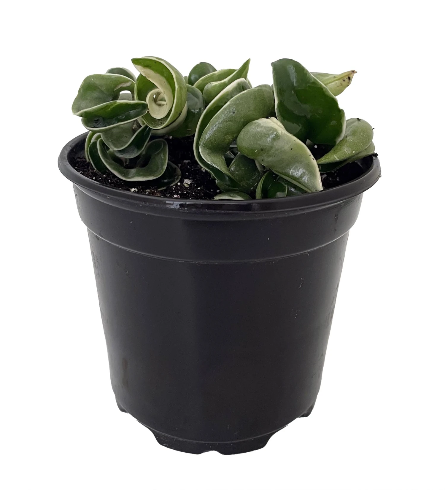 The Variegated Hindu Rope Plant is an exotic house plant native to the far east. It is rather easy to grow and can reach lengths of over 8 feet! The plant is easy to grow. It does best in a filtered light window and watered when dry. The plant prefers to be pot bound. The plant has thick, convoluted, green, pink, and white leaves, arranged on trailing, twisted stems. Small, white, waxy flowers have red centers and are very fragrant. It is related to the Wax Plant.